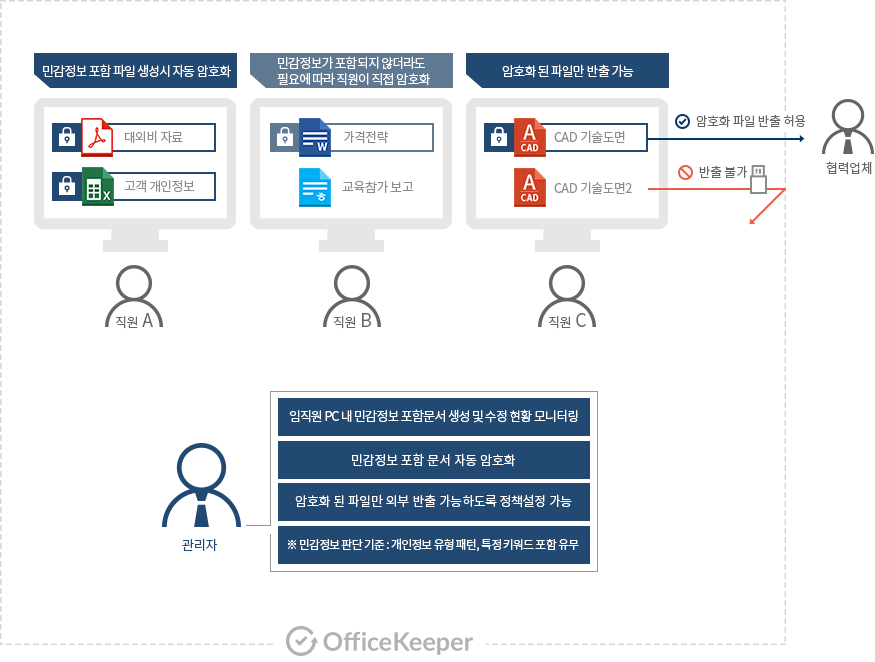 PC에 저장된 개인정보, 회사 기밀정보 등 민감정보를 포함한 문서를 검출하고 암호화할 수 있으며, 민감정보의 외부 반출을 제어할 수 있습니다.