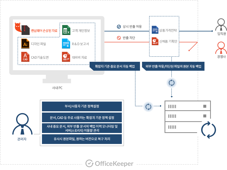 PC에 저장된 파일과 유출된 파일을 자동 백업해 고의적인 삭제나 랜섬웨어에 의한 정보 유실에 대비할 수 있으며, 유출 사고 발생 시 증거 자료로 활용할 수 있습니다.