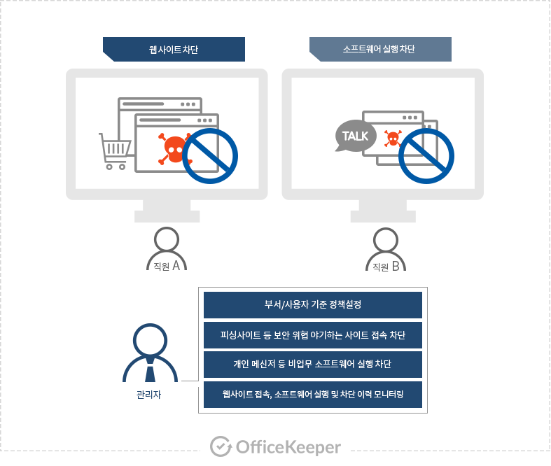 악성코드를 배포하는 각종 유해사이트나 업무 몰입을 방해하는 웹사이트 접속, 소프트웨어 실행을 차단/경고함으로써 업무 생산성을 향상시킬 수 있습니다.