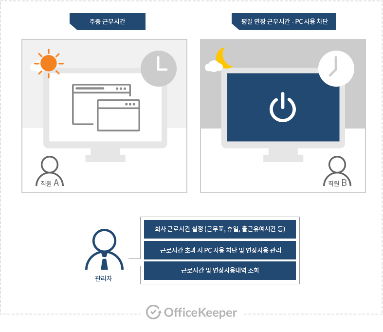 근로시간 외 PC 사용 차단, 연장사용 설정, 이력 조회 기능을 제공하여 주 52시간 법정 근로시간 준수가 가능합니다.