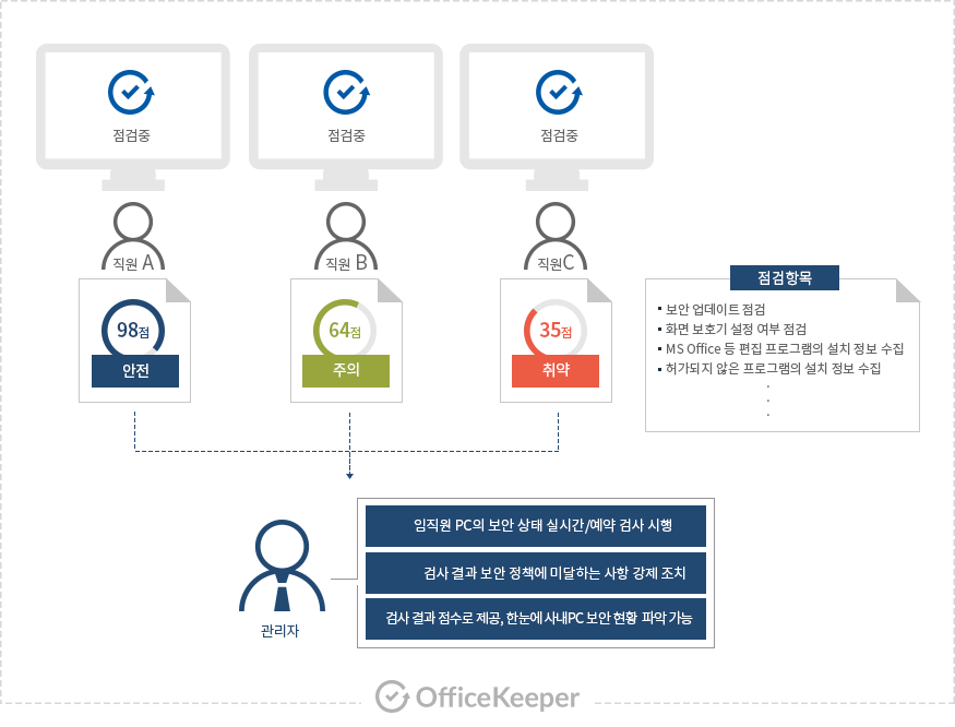 PC의 보안 상태를 점검하고 원하는 수준으로 강제 조치함으로써 회사 PC의 보안수준을 안전하게 유지할 수 있습니다.